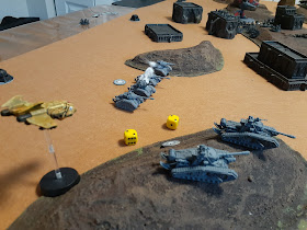 In the first round the detachment orders were a nomination of march and advance. This is probably quite typical. The only exception would be if Titans were facing other Titans then I would definitely put the Titan on First Fire orders. In this game the Warhound had a Gravitation Gun and a Turbo-Laser. Since the Grav Gun has only a 30” range, medium range for titans but longer than most vehicle or infantry weapons, it advanced. In future games I think I would try and give Titans weapons with ranges that are 40 plus so they can reach most of the board from their deployment spot and spend the entire game on First Fire. In this game the hound got lucky as a large marine detachment (8 stands) occupied a building within range and the building was brought down with a single grav gun hit (most weapons can't do this but buildings are far from invulnerable) all but one marine stand was destroyed in the collapse. I don't think the shot had a lucky roll, just that the opportunity was lucky. Even through the fire raptor had advanced orders and could have deployed to the board, it chose not to since it could not get into the rear arc of its desired target, the armoured units. Every turn flyers moves onto the board from the deployment zone edge (including the small bit on the sides), and then removed in the end phase of each turn. This means that it would take two turns of an enemies advance before the Raptor could get rear shots on the tanks. Otherwise the armoured detachments blasted away at each other. Typically each main battle tank has a one dice primary weapon and possibly an anti tank secondary weapon. Each system hits on around 4+. The Leman Russ would save vs a lascannon on 3+ but the predators saved vs the vanquisher on a 5+, not to mention the range advantage of the vanquisher. Dice were on the marines side, one Predator and two Leman Russ were destroyed.