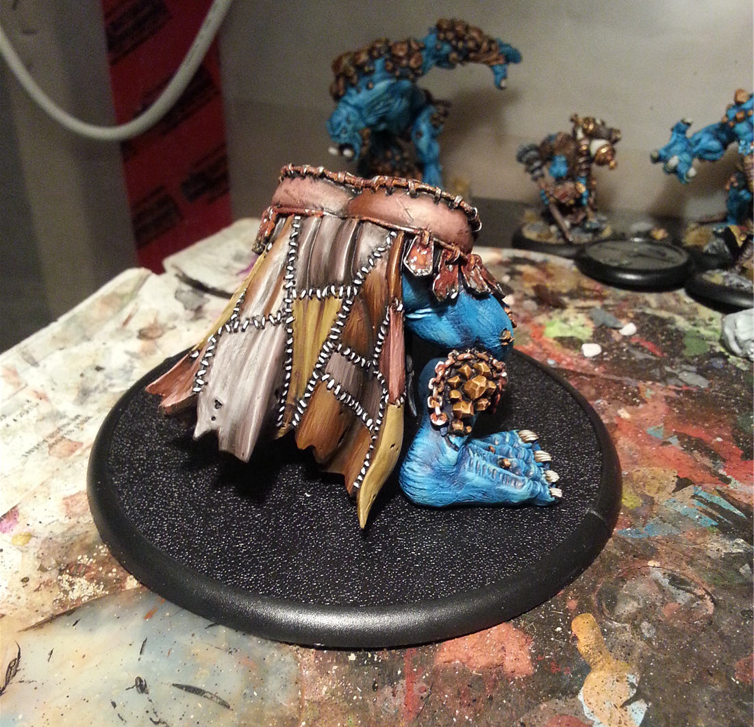 I know what you are wondering when looking at this model "Is that guy armed with giant powder kegs of explosives that he throws at his enemies?!?!". The answer is yes, and that is why he is awesome lol. I am finding the more of these larger Warbeasts I am doing the better and faster I am getting which is really nice. This guy actually didnt take that long (2-3 hours) and I am really happy how he turned out.