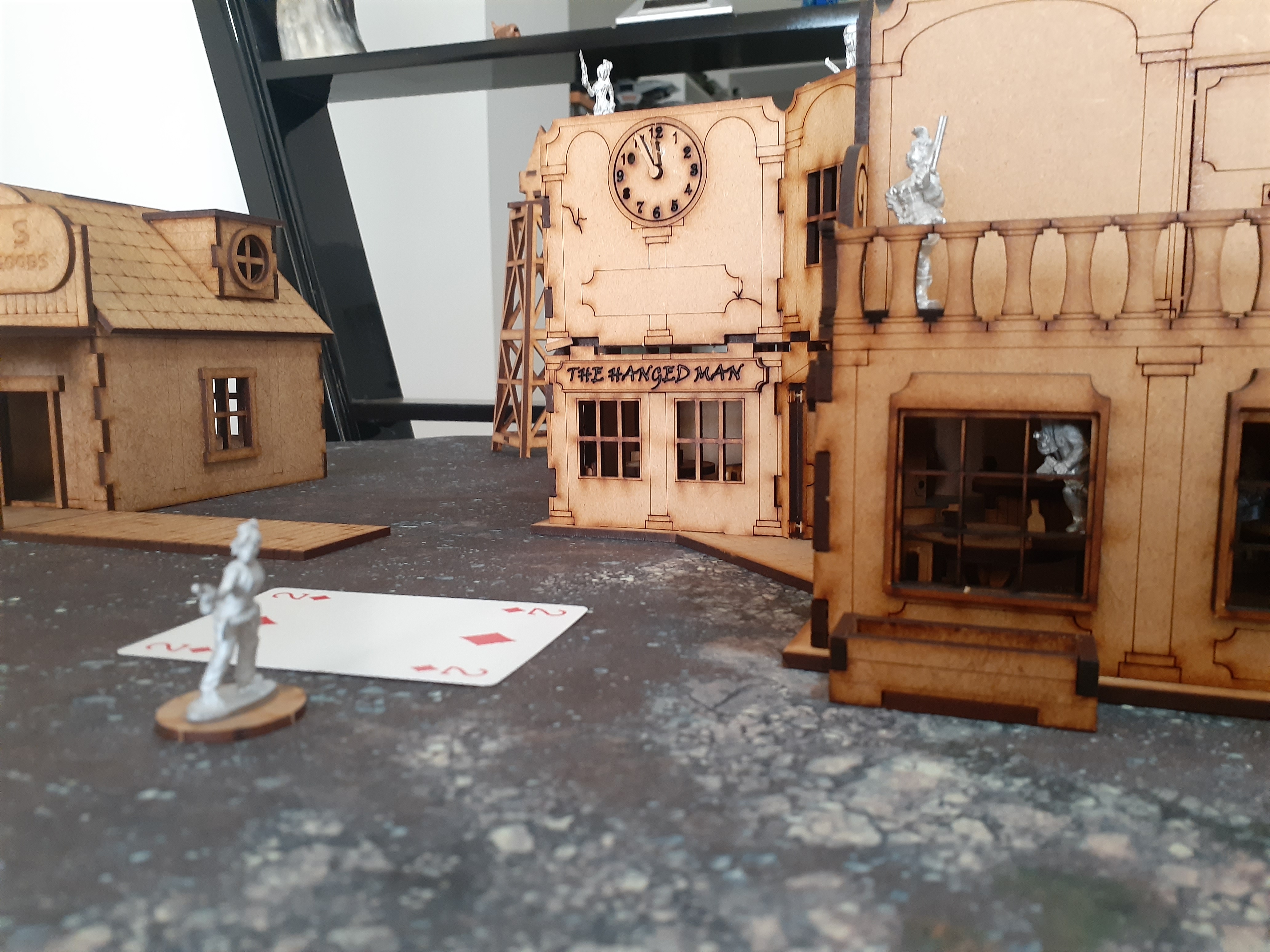 Yesterday my good friend introduced me to a skirmish game called Dead Man's Hand. I found it to be a fast paced and engaging game. It has a very thematic Wild West setting, that pits rival gangs against each other in situations reminiscent of your favorite western. Thanks in part to all the great scenery my friend has (but hasn't painted :) ), it is very easy to imagine your gang members crashing through saloon windows or unloading their shot guns at point blank range, and the random activation using playing cards are great!